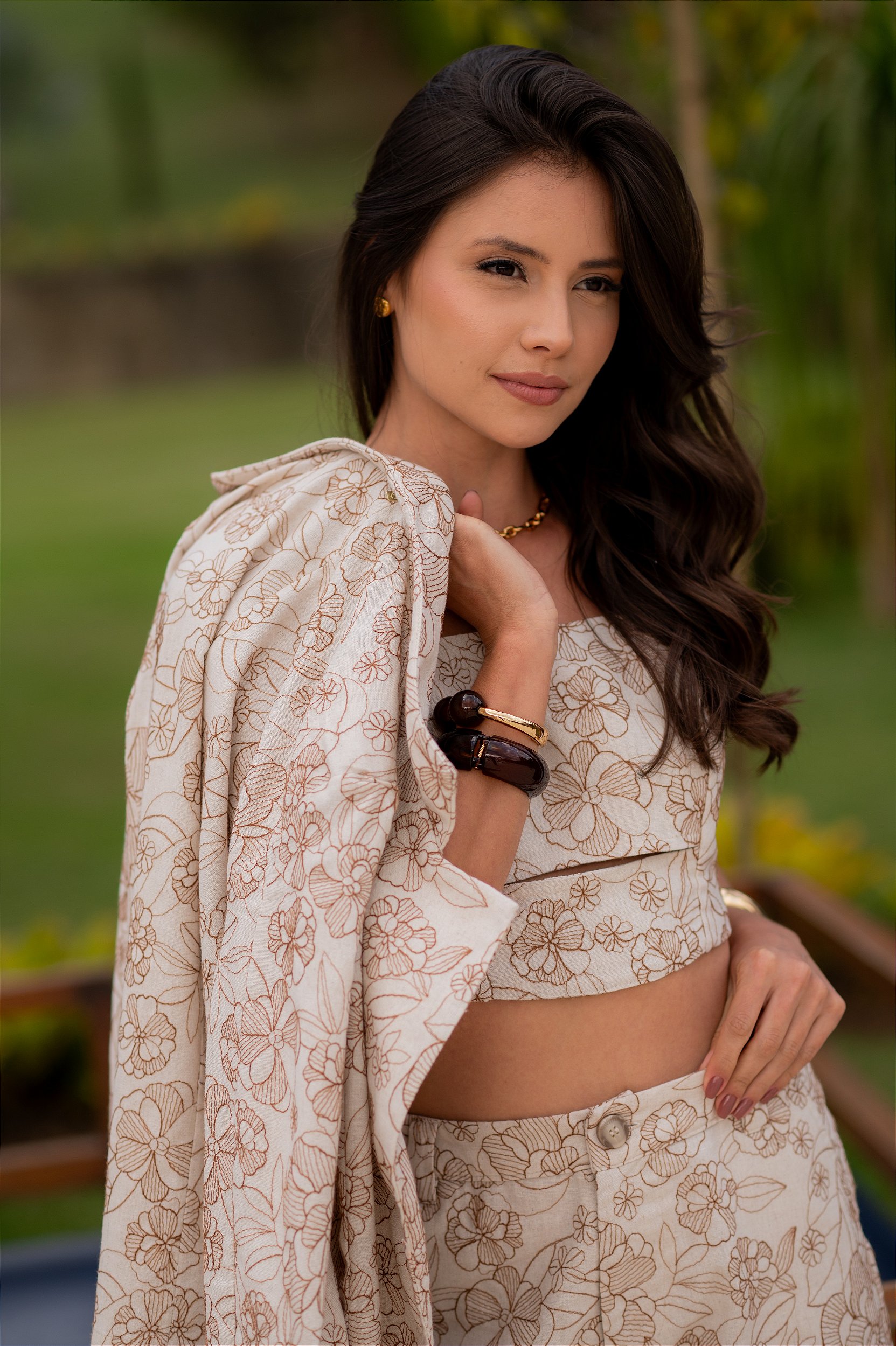 Confeccionado na cor cru, ele recebe bordados em tom de ocre, que trazem charme artesanal e elegância atemporal à peça.